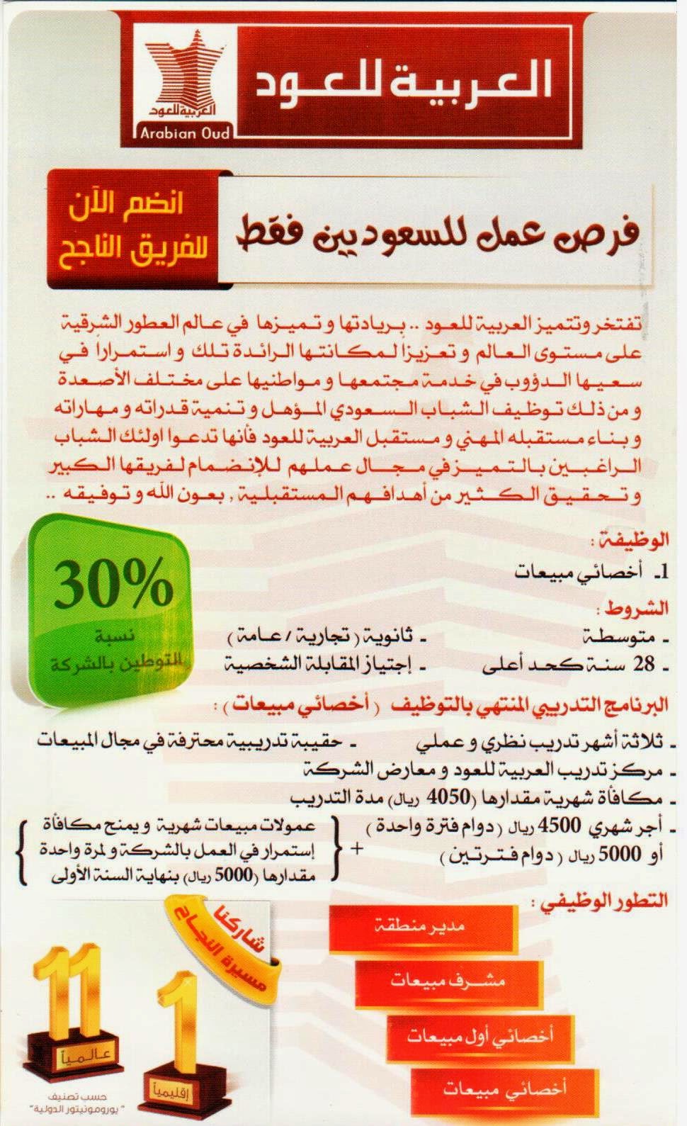 وظائف العربية للعود في الشرقية اخصائي مبيعات رواتب حتى 5000 ريال
