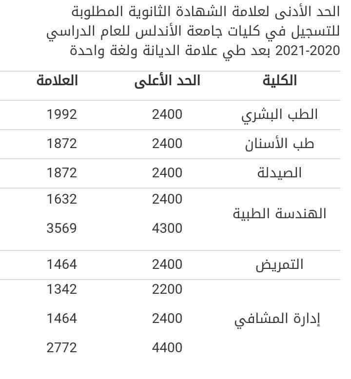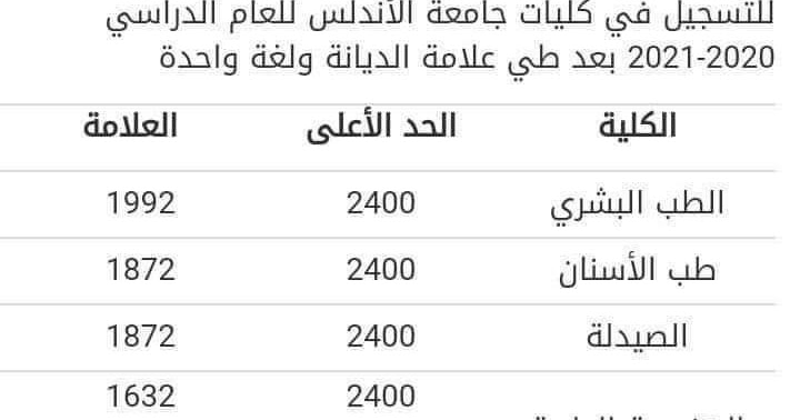 الحد الأدني لعلامة البكالوريا للتسجيل في جامعة الأندلس 2020 2021